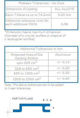The tolerance on a dimension “A” will be the value shown on the table. This tolerance must be increased where the parting line of the die, or moving die parts, affect dimension A